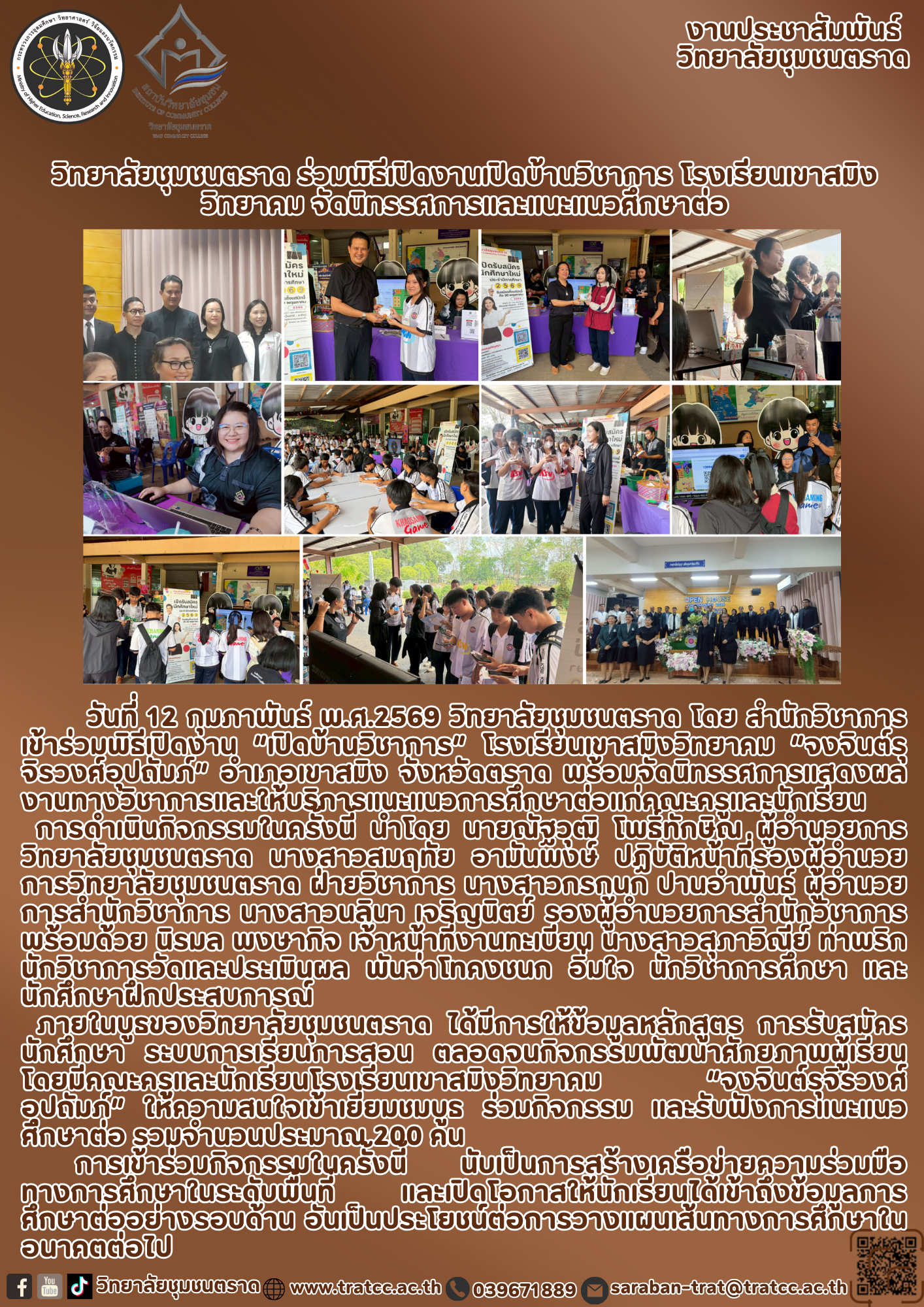 วิทยาลัยชุมชนตราด ร่วมพิธีเปิดงานเปิดบ้านวิชาการ โรงเรียนเขาสมิงวิทยาคม จัดนิทรรศการและแนะแนวศึกษาต่ออ