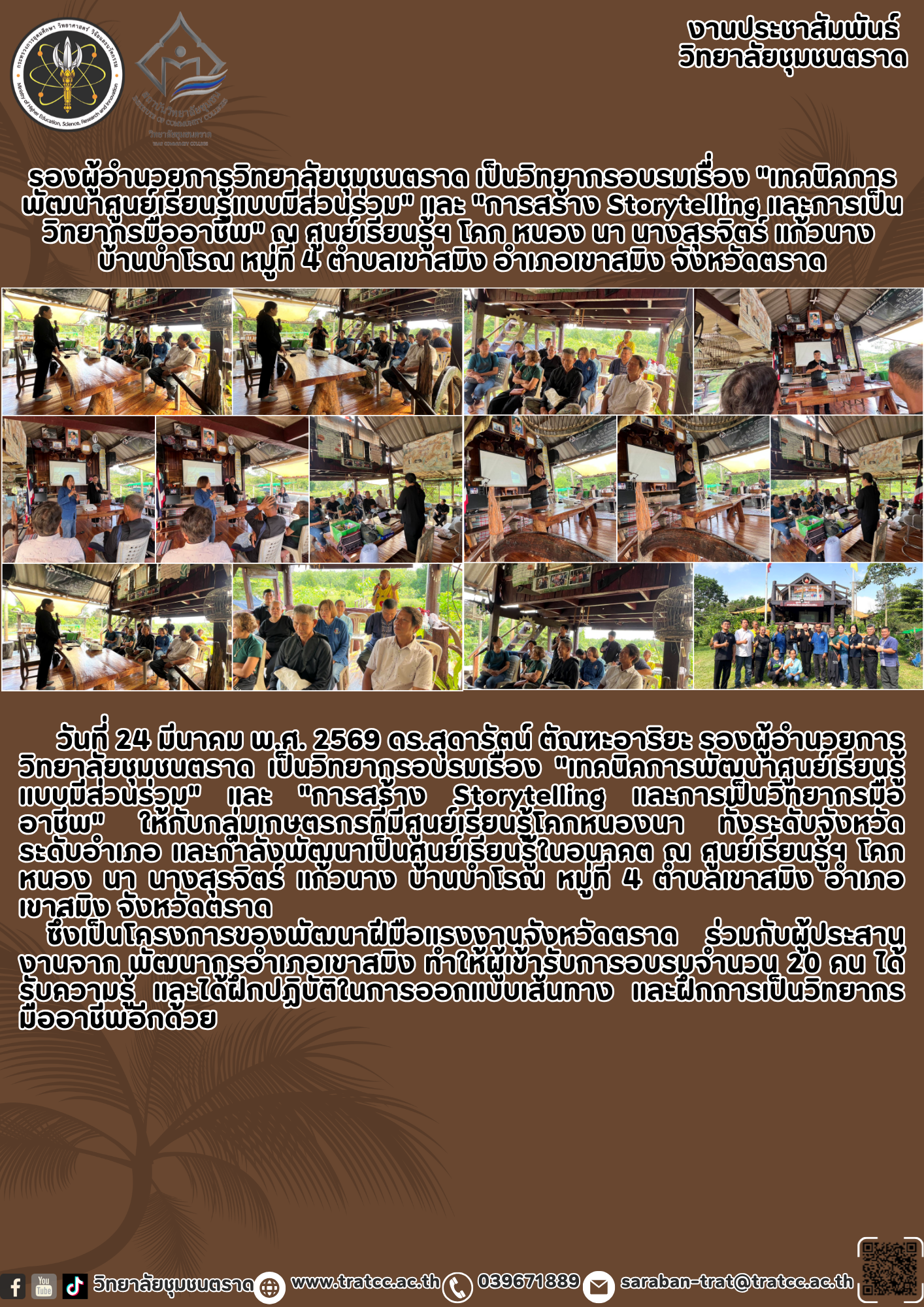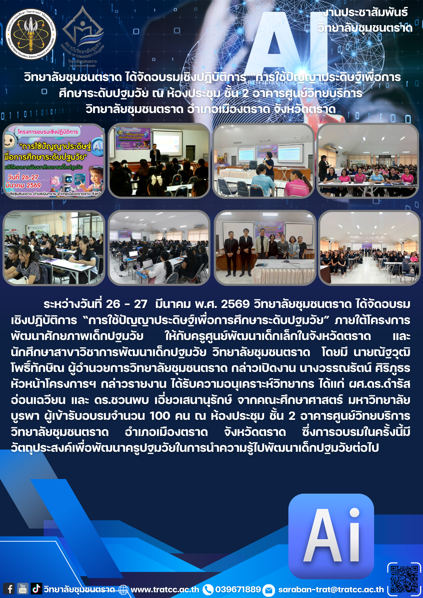 วิทยาลัยชุมชนตราด จัดโครงการฝึกอบรมเชิงปฏิบัติการคลินิกเทคโนโลยีดิจิทัลเพื่อการรู้เท่าทันสื่อและโลกออนไลน์ ประจำปีงบประมาณ 2569 ณ วิทยาลัยชุมชนตราด ตำบลเนินทราย อำเภอเมืองตราด จังหวัดตราด