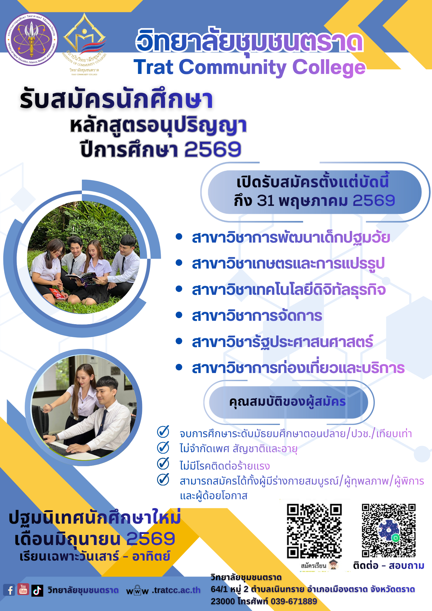 16 ต.ค. 2568 ประกาศวิทยาลัยชุมชนตราด เรื่อง ประกาศรับสมัครพนักงานจ้างเหมาบริการ ประจำปีงบประมาณ 2569