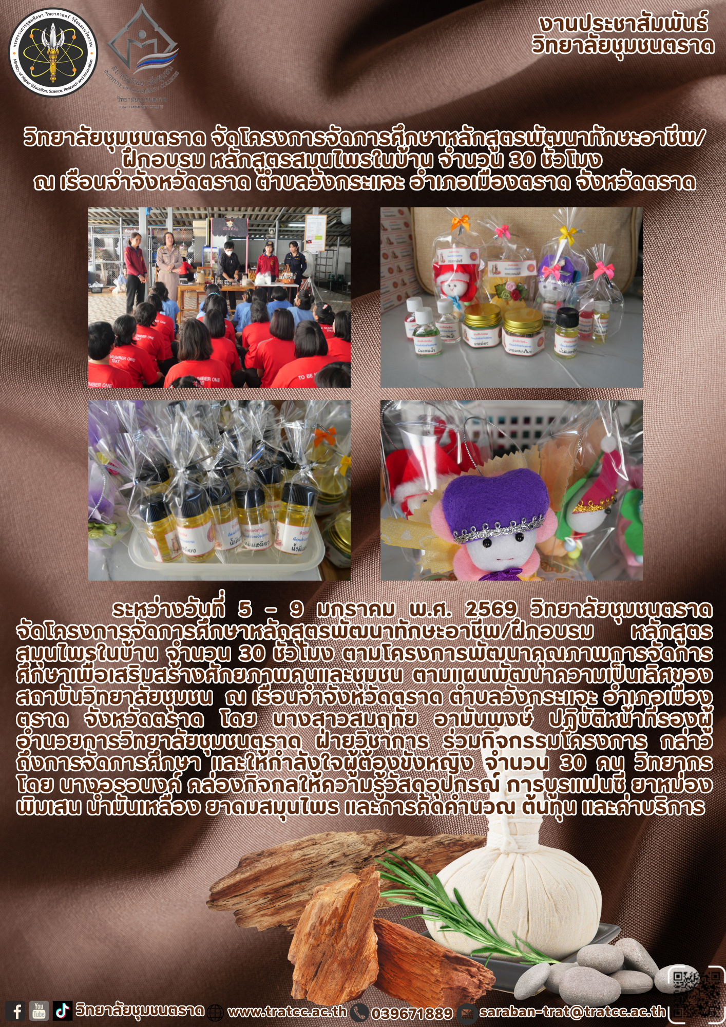 วิทยาลัยชุมชนตราด เข้าร่วมให้ข้อมูลการพัฒนาอาชีพผู้สูงอายุตำบลท่าโสม ผลิตภัณฑ์ “ซอสหอยนางรม” ในโครงการตรวจคัดเลือกเกษตรกร และสถาบันเกษตรกรดีเด่นด้านประมงระดับประเทศ ฯ กลุ่มเกษตรกรทำการประมง หรือกลุ่มเกษตรกรเพาะเลี้ยงสัตว์เลี้ยง ระดับประเทศ ณ วิสาหกิจชุมชนหอยนางรมท่าโสม อำเภอเขาสมิง จังหวัดตราด