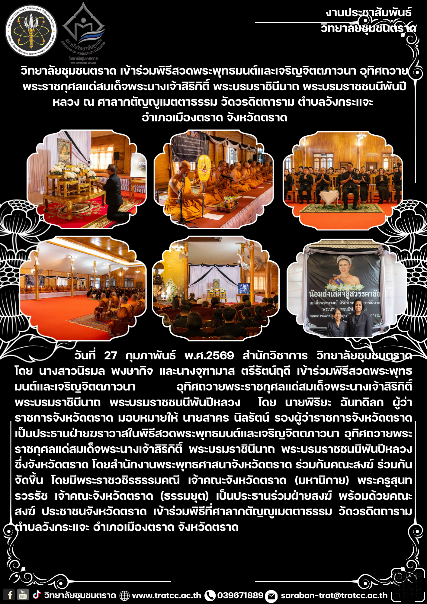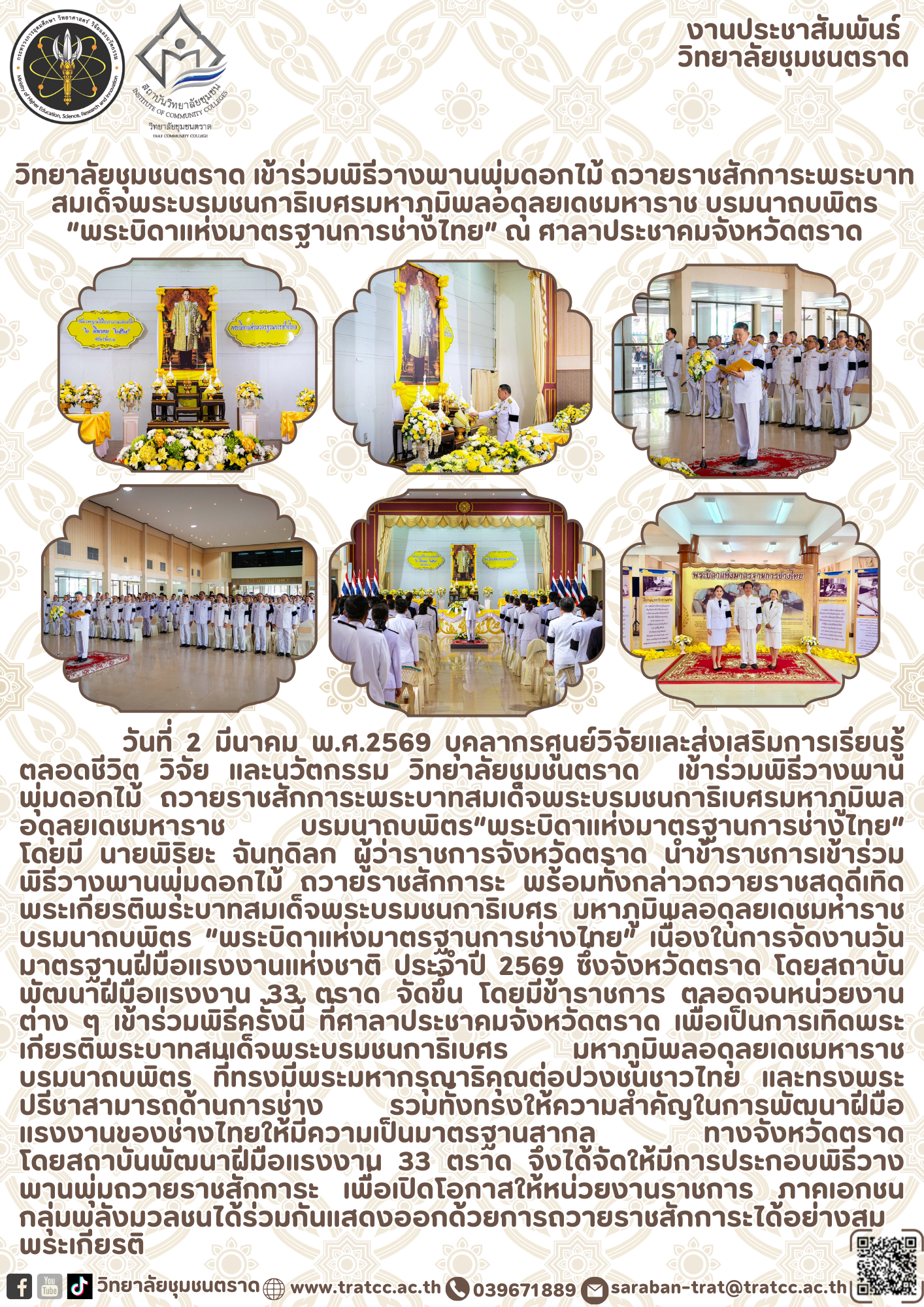 วิทยาลัยชุมชนตราด เข้าร่วมพิธีวางพานพุ่มดอกไม้ ถวายราชสักการะพระบาทสมเด็จพระบรมชนกาธิเบศร มหาภูมิพลอดุลยเดชมหาราช บรมนาถบพิตร “พระบิดาแห่งมาตรฐานการช่างไทย” ณ ศาลาประชาคมจังหวัดตราด