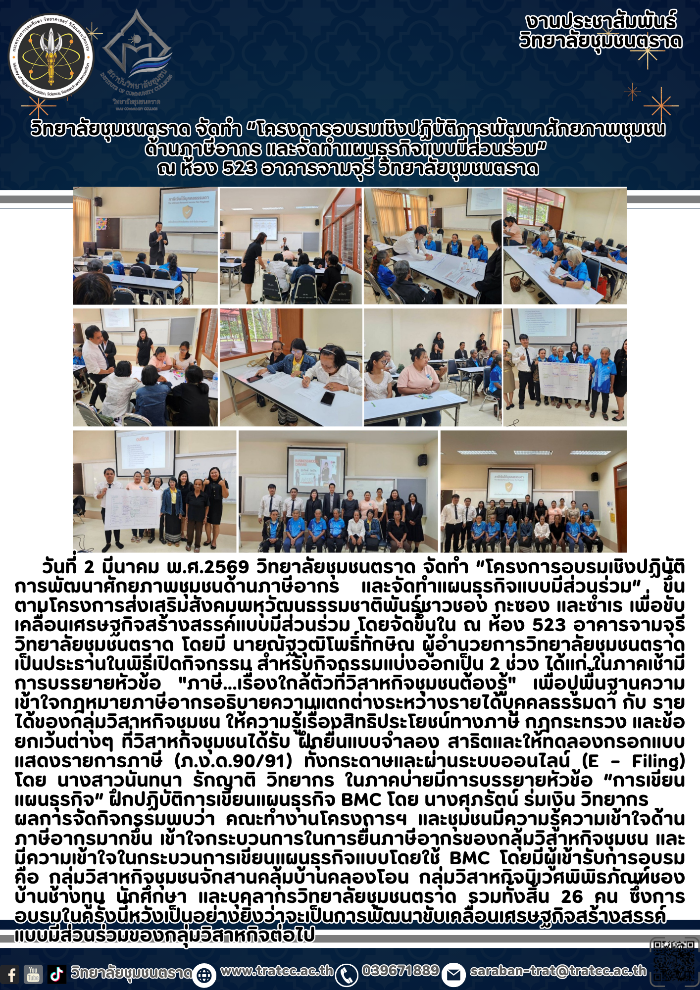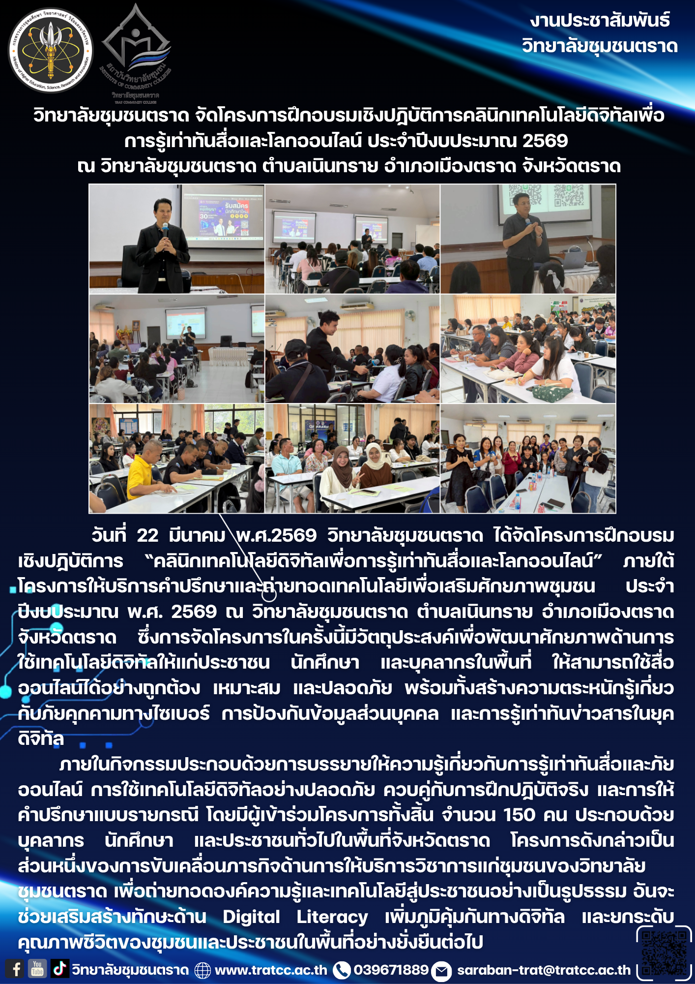วิทยาลัยชุมชนตราด จัดโครงการฝึกอบรมเชิงปฏิบัติการคลินิกเทคโนโลยีดิจิทัลเพื่อการรู้เท่าทันสื่อและโลกออนไลน์ ประจำปีงบประมาณ 2569 ณ วิทยาลัยชุมชนตราด ตำบลเนินทราย อำเภอเมืองตราด จังหวัดตราด