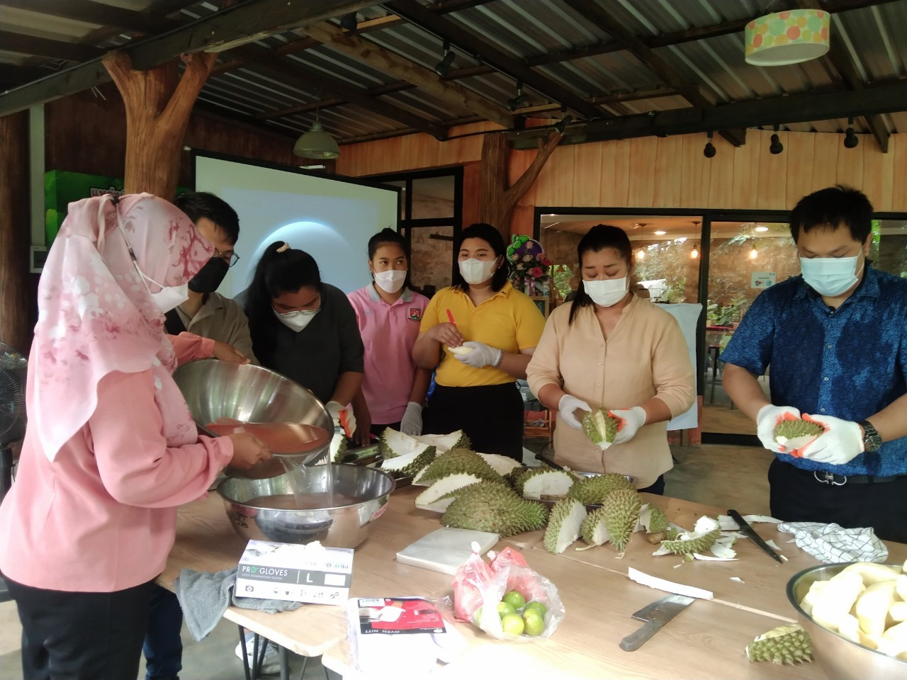 โดยการจัดกิจกรรมในครั้งนี้ เป็นการต่อยอดจากปี พ.ศ. 2564 โครงการยกระดับเศรษฐกิจและสังคมรายตำบลแบบบูรณาการ (มหาวิทยาลัยสู่ตำบล หรือ U2T) ซึ่งได้ทำงานร่วมกับกลุ่มสตรีตำบลทุ่งนนทรี อำเภอเขาสมิง จังหวัดตราด เรื่องการแปรรูปทุเรียนเกรดคัดไซส์ที่ถูกคัดออก ที่มีราคาประมาณครึ่งหนึ่งของราคารับซื้อหน้าสวน มาแปรรูปเป็นผลิตภัณฑ์ใหม่ “ทุเรียนเชื่อม” โดยวัตถุประสงค์ของการจัดกิจกรรมในครั้งนี้ คือ เพื่อพัฒนาการแปรรูปทุเรียนเชื่อมในครัวเรือนให้มีคุณภาพ โดยการสร้างเอกลักษณ์ให้แก่ทุเรียนหมอนทองของตำบลทุ่งนนทรี ภายใต้แบรนด์ “ศาลาแดง” และเพื่อแปรรูปผลิตภัณฑ์ทุเรียนเชื่อม ให้สามารถเก็บรักษาและบริโภคนอกฤดูกาลได้ ด้วยการผลิตที่ผ่านกระบวนการฆ่าเชื้อ โดยมีนายรุ่งโรจน์ ตับกลาง จากคณะเทคโนโลยีอุตสาหกรรมการเกษตร มหาวิทยาลัยเทคโนโลยีราชมงคลตะวันออก เป็นวิทยากรเกี่ยวกับกระบวนการฆ่าเชื้อ จากนั้นกลุ่มสตรีประจำตำบลและผู้รับจ้างงาน ได้ร่วมกันลงมือปฏิบัติการผลิตทุเรียนเชื่อมและการฆ่าเชื้อเพื่อการยืดอายุการเก็บรักษาได้ประมาณ 6 เดือน ตามที่ได้เรียนรู้และสามารถนำไปขยายผลกับประชาชนและผลิตภัณฑ์อื่นต่อไป