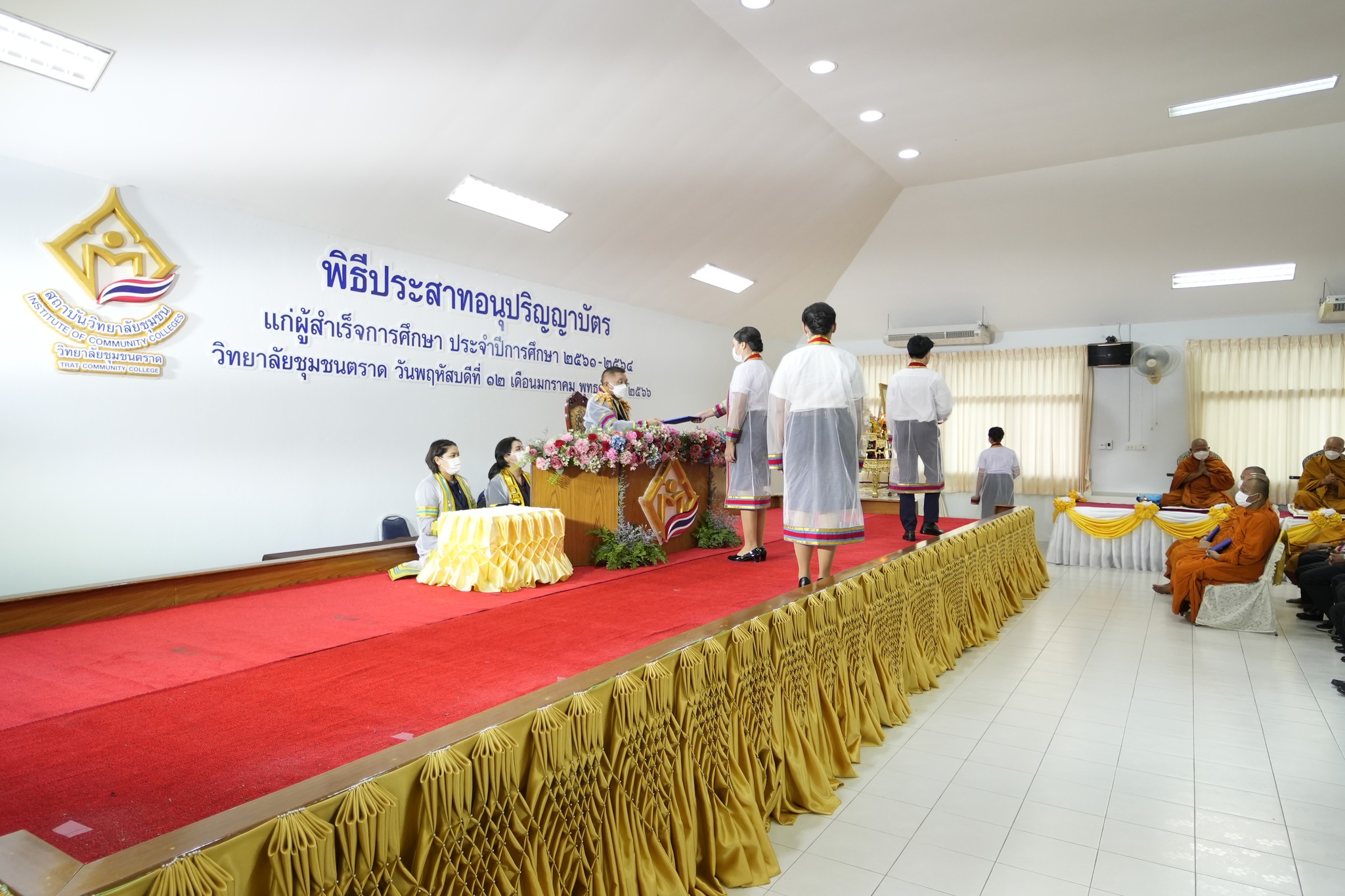ในวันที่ ๑๒ มกราคม ๒๕๖๖ นายอรรถนิติ ดิษฐอำนาจ องคมนตรี เป็นประธานในพิธีประสาทอนุปริญญาบัตรแก่ผู้สำเร็จการศึกษาวิทยาลัยชุมชนตราด ประจำปีการศึกษา ๒๕๖๑ – ๒๕๖๔ ณ ห้องประชุมชั้น ๒ อาคารศูนย์วิทยบริการ วิทยาลัยชุมชนตราด อำเภอเมืองตราด จังหวัดตราด โดยมี นายชำนาญวิทย์ เตรัตน์ ผู้ว่าราชการจังหวัดตราด นายนำชัย กฤษณาสกุล รักษาราชการแทนผู้อำนวยการสถาบันวิทยาลัยชุมชน คณะกรรมการสภาวิทยาลัยชุมชนตราด คณะกรรมการส่งเสริมกิจการวิทยาลัยชุมชนตราด คณะอนุกรรมการวิชาการวิทยาลัยชุมชนตราด ผู้อำนวยการวิทยาลัยชุมชนตราด หัวหน้าส่วนราชการ คณะผู้บริหาร คณาจารย์ ตลอดจนนักศึกษาร่วมต้อนรับประธานในพิธี ฯ